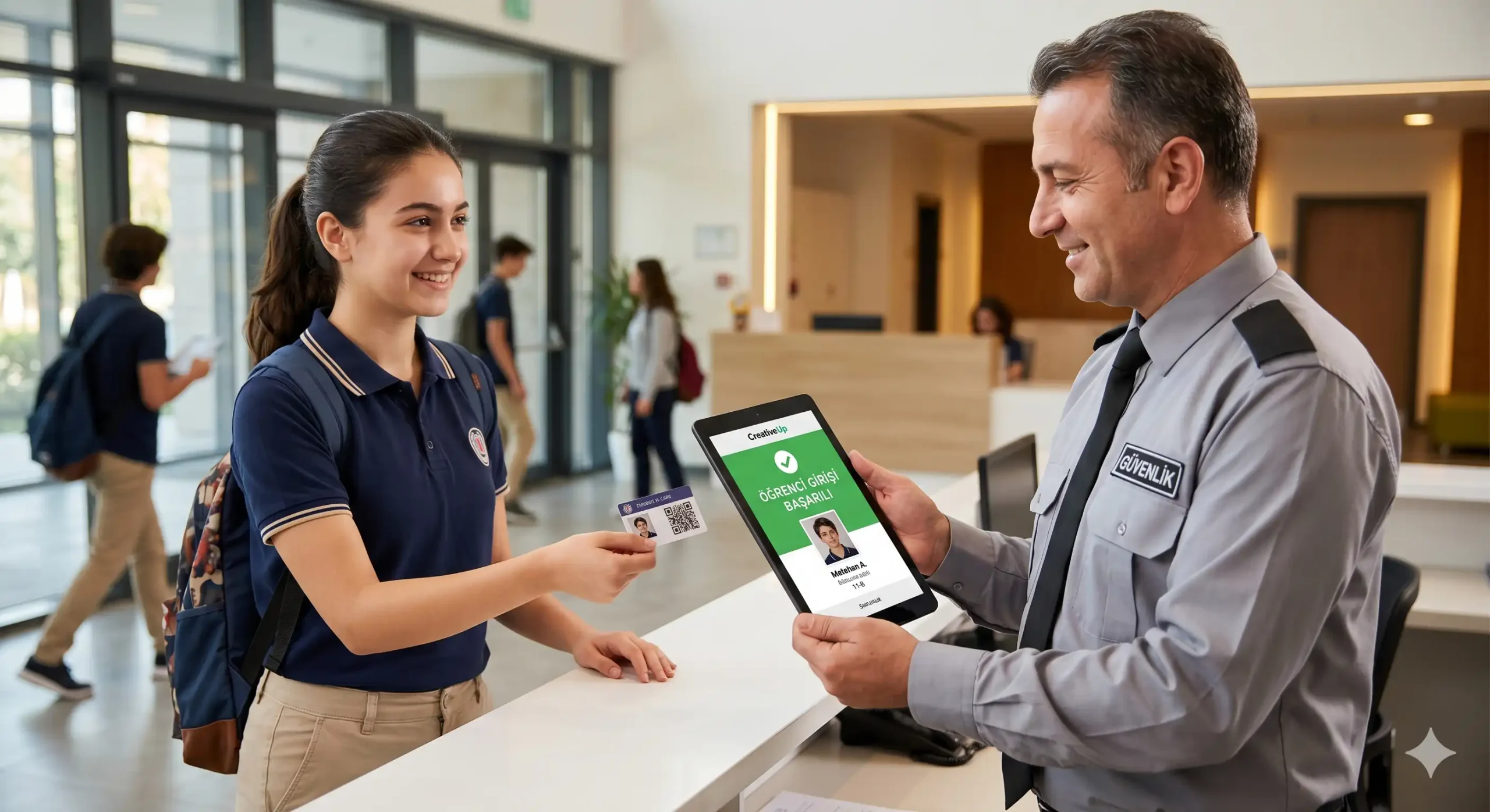 Sisteme kayıt edilen her öğrenciye özel bir dijital kimlik (QR) atanır. Güvenlik görevlisi, Creative Up arayüzü üzerinden bu kodu saniyeler içinde tarar. Fotoğraflı doğrulama sayesinde başkasının koduyla giriş yapılması imkansız hale gelir.